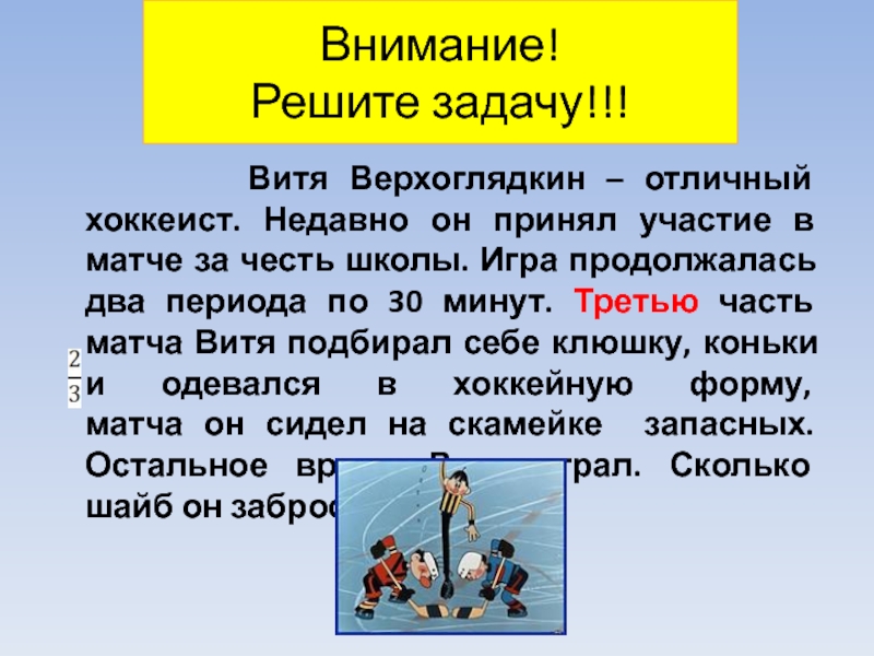 Внимание! Решите задачу!!!      Витя Верхоглядкин – отличный хоккеист. Недавно он принял