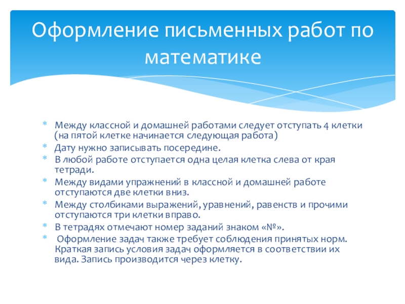 Между видами упражнений в классной и домашней работе отступаются две клетки вниз.