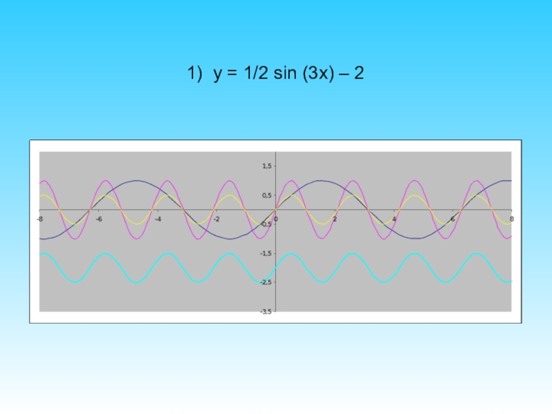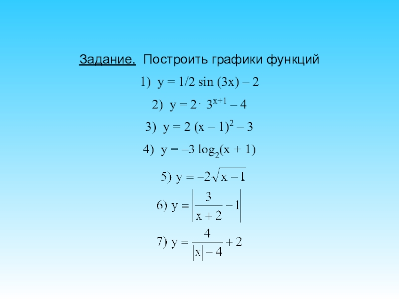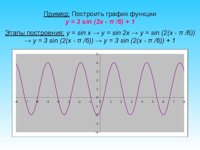 Этапы построения: y = sin x → y = sin 2x → y = sin (2(x - π /6)) → y = 3 sin (2(x - π /6)) → y = 3 sin (2(x - π /6)) + 1