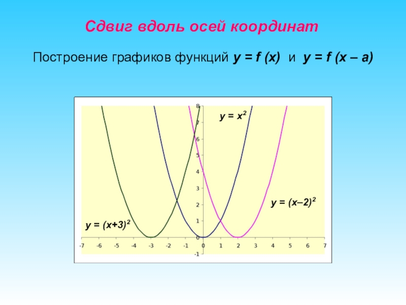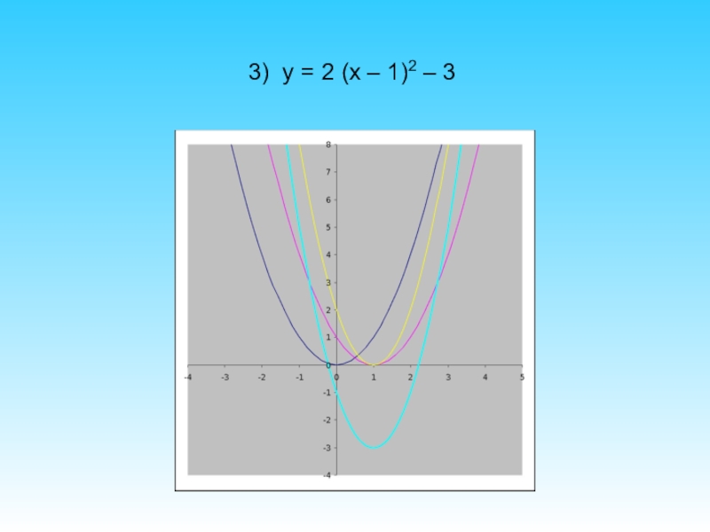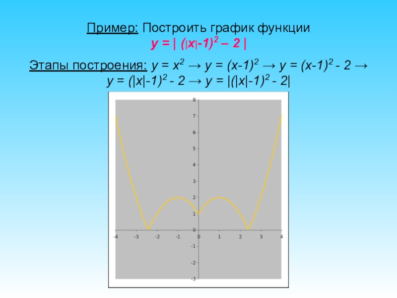 Этапы построения: y = x2 → y = (x-1)2 → y = (x-1)2 - 2 → y = (|x|-1)2 - 2 → y = |(|x|-1)2 - 2|