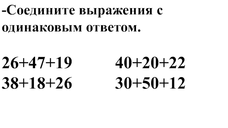 -Соедините выражения с одинаковым ответом. 26+47+19     40+20+2238+18+26     30+50+12