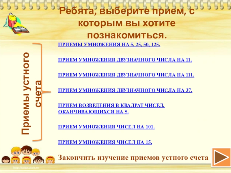 Закончить изучение приемов устного счета