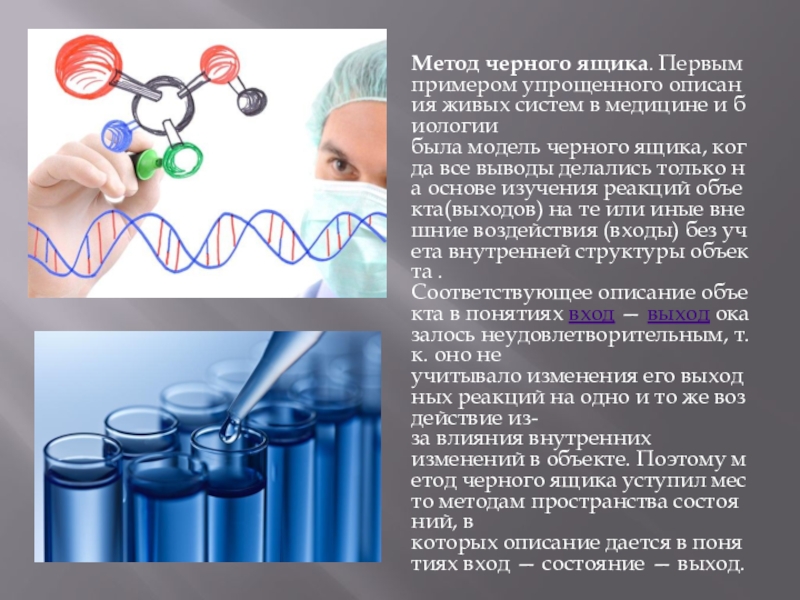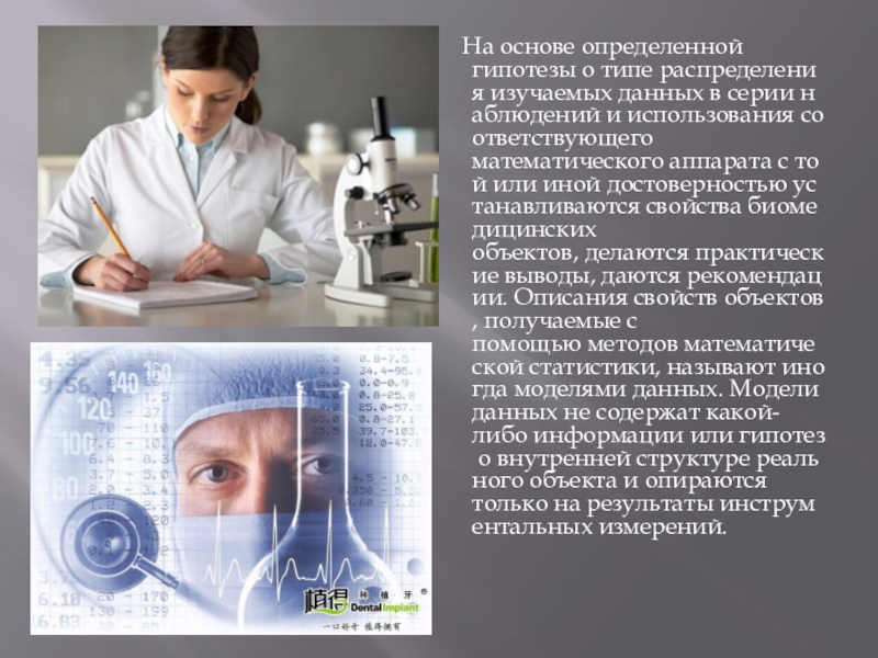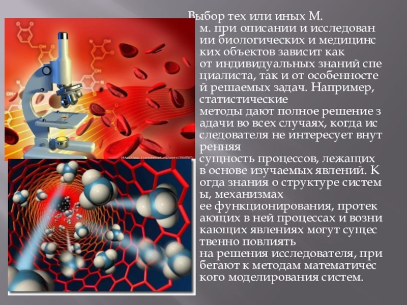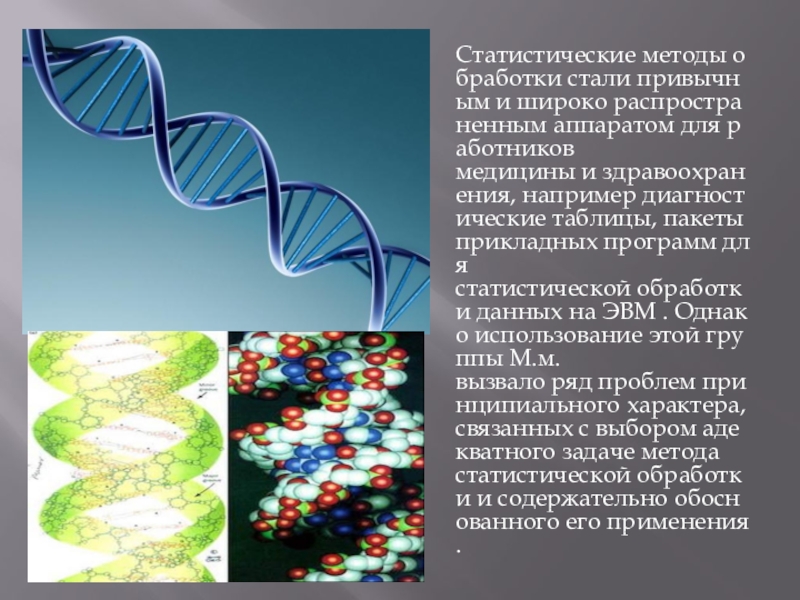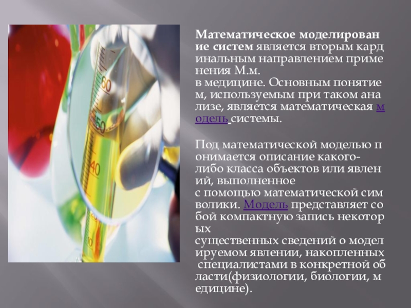 Математические методы в медицине — совокупность методов количественного изучения и анализа состояния и (или) поведения объектов и систем, относящихся к медицине и здравоохранению. В биологии, медицине и здравоохранении в круг явлений, изучаемых с помощью М.м., входят процессы , происходящие на уровне целостного организма, его систем, органов и тканей (в норме и при патологии);заболевания и способы их лечения; приборы и системы медицинской техники; популяционные и организационные аспекты поведения сложных систем в здравоохранении; биологические процессы , происходящие на молекулярном уровне.