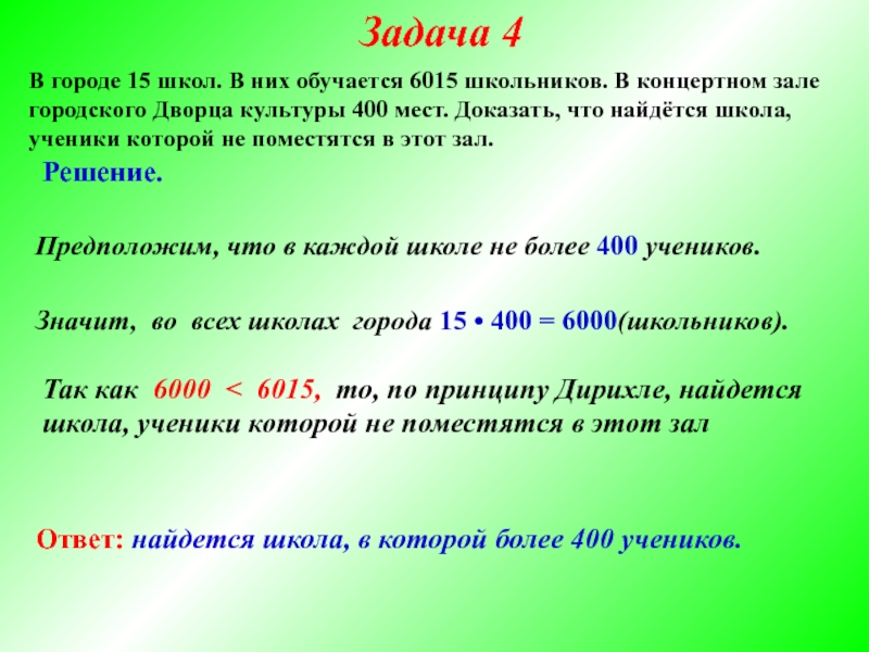 Так как 5 > 4, то, по принципу Дирихле, найдется, как минимум, одна «клетка», в которой будут сидеть, по крайней мере, 2 «зайца».