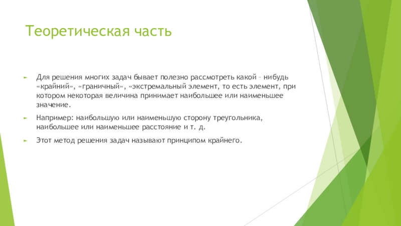 Теоретическая частьДля решения многих задач бывает полезно рассмотреть какой – нибудь «крайний», «граничный», «экстремальный элемент, то есть элемент, при котором некоторая величина принимает наибольшее или наименьшее значение.Например: наибольшую или наименьшую сторону треугольника, наибольшее или наименьшее расстояние