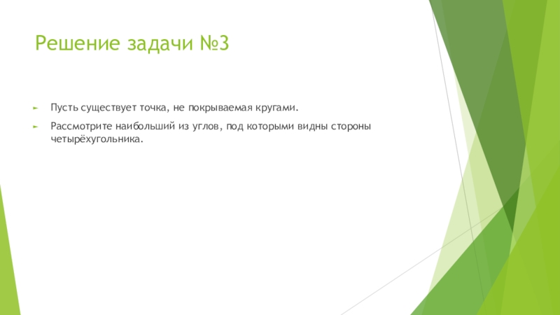 Решение задачи №3Пусть существует точка, не покрываемая кругами.Рассмотрите наибольший из углов, под которыми видны стороны четырёхугольника.