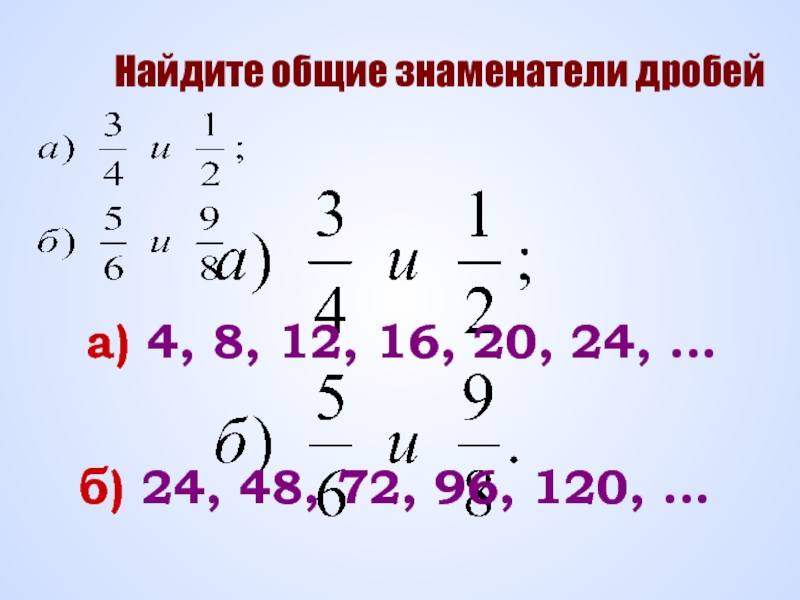 Найдите общие знаменатели дробейа) 4, 8, 12, 16, 20, 24, …б) 24, 48, 72, 96, 120, …