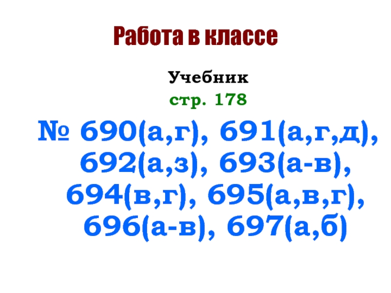 Работа в классеУчебникстр. 178№ 690(а,г), 691(а,г,д), 692(а,з), 693(а-в), 694(в,г), 695(а,в,г), 696(а-в), 697(а,б)