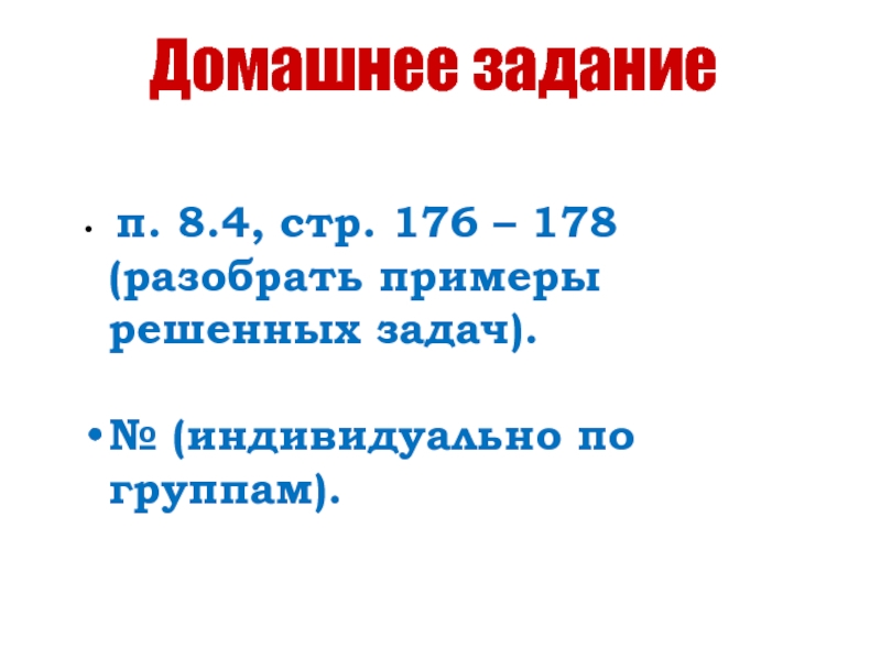 Домашнее задание п. 8.4, стр. 176 – 178 (разобрать примеры решенных задач). № (индивидуально по группам).