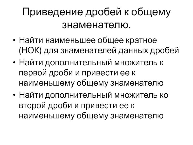 Приведение дробей к общему знаменателю.Найти наименьшее общее кратное (НОК) для знаменателей данных дробейНайти дополнительный множитель к первой