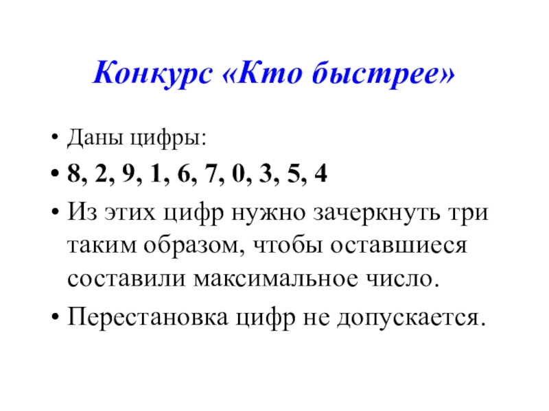 Из этих цифр нужно зачеркнуть три таким образом, чтобы оставшиеся составили максимальное число.