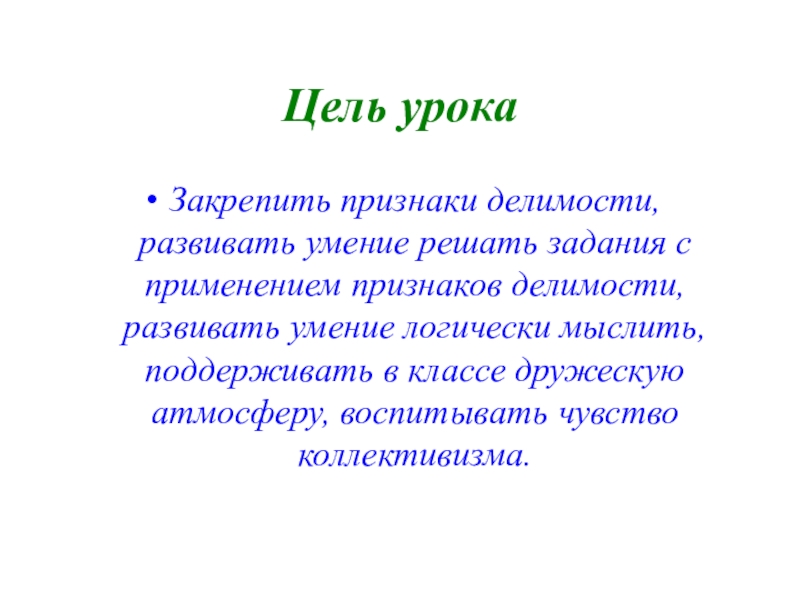 делимости, развивать умение логически мыслить, поддерживать в классе дружескую атмосферу, воспитывать чувство коллективизма.