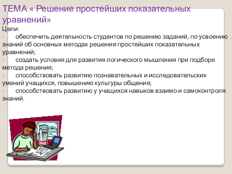 ТЕМА « Решение простейших показательных  уравнений»Цели: ·        обеспечить деятельность студентов по решению заданий, по усвоению знаний об основных методах решения простейших показательных  уравнений;·        создать условия для развития логического мышления при подборе метода решения;·        способствовать развитию познавательных