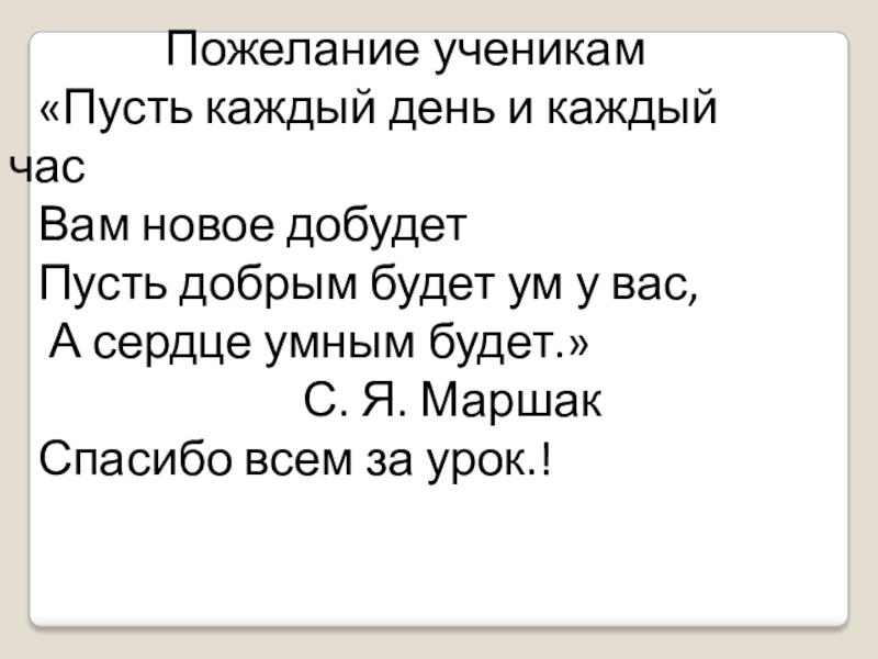 Пожелание ученикам«Пусть каждый день и каждый час Вам новое добудет Пусть добрым будет ум у вас, А сердце