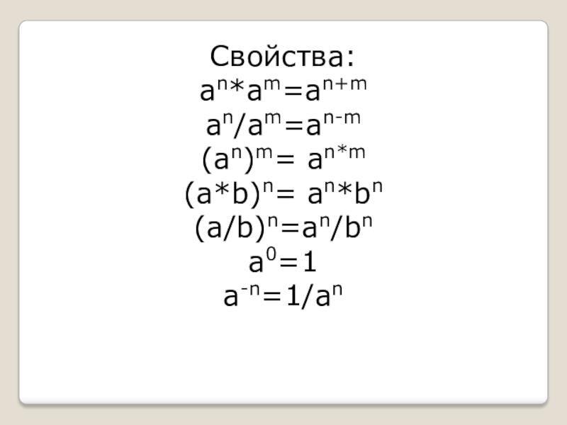 Свойства:an*am=an+man/am=an-m(an)m= an*m(a*b)n= an*bn(a/b)n=an/bna0=1a-n=1/an