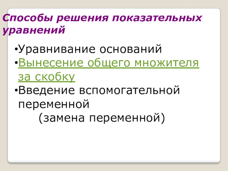 Способы решения показательных уравненийУравнивание оснований Вынесение общего множителя за скобкуВведение вспомогательной переменной   (замена переменной)