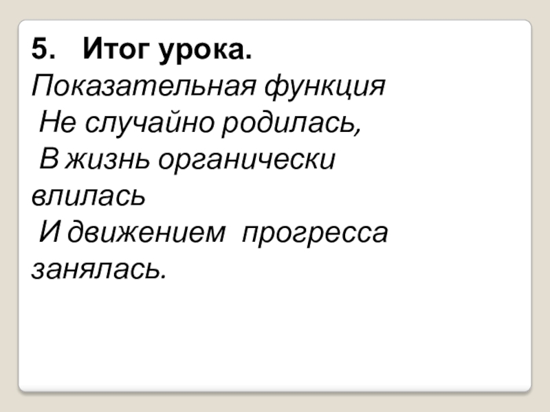 5.   Итог урока.Показательная функция  Не случайно родилась, В жизнь органически влилась И движением прогресса занялась.