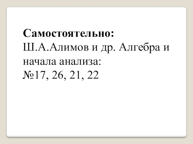 Самостоятельно:Ш.А.Алимов и др. Алгебра и начала анализа:№17, 26, 21, 22
