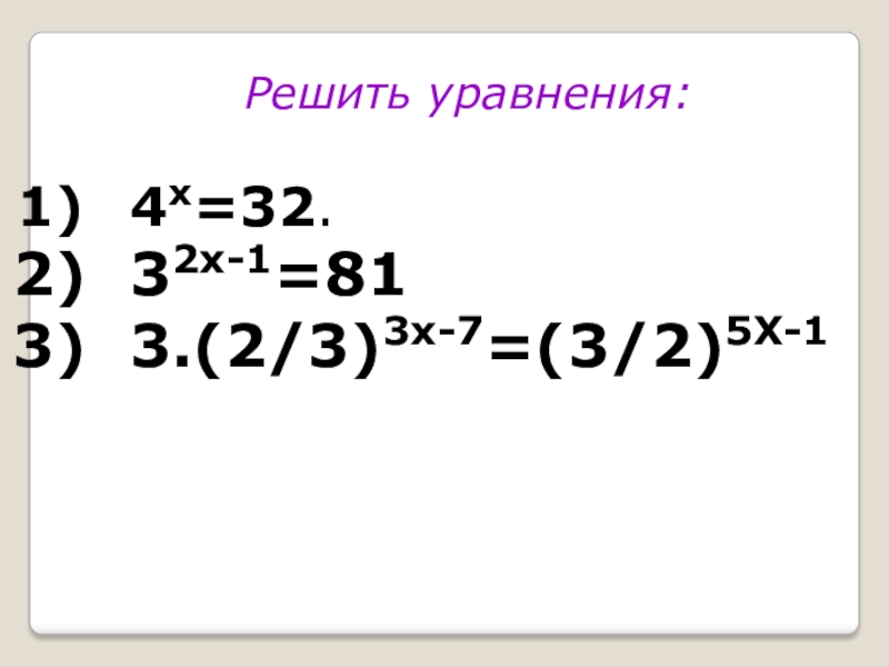 Решить уравнения:4x=32. 32x-1=813.(2/3)3x-7=(3/2)5X-1