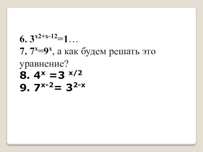 6. 3x2+x-12=1…7. 7x=9x, а как будем решать это уравнение?8. 4x =3 x/29. 7x-2= 32-x