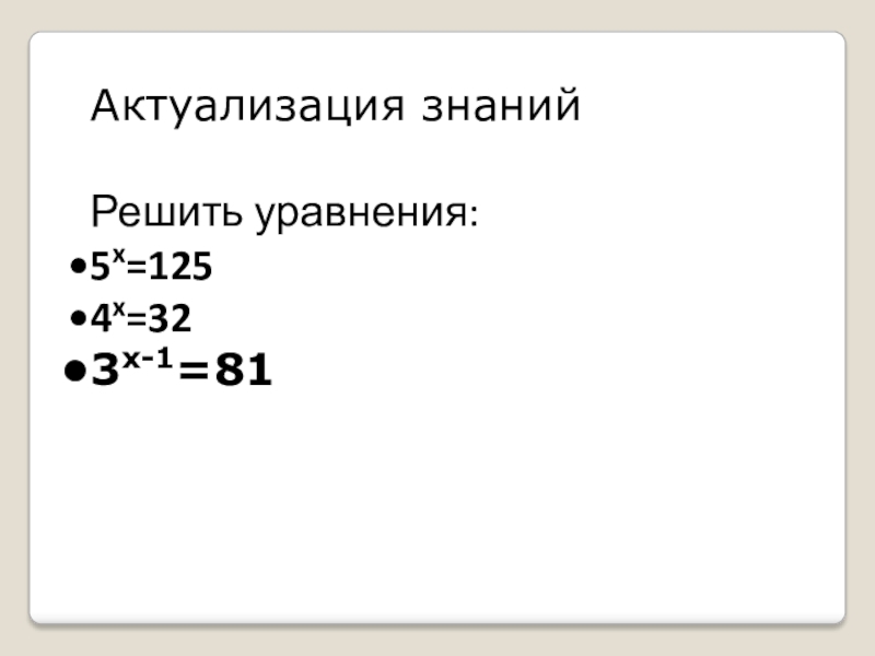 Актуализация знанийРешить уравнения:5x=1254x=323x-1=81