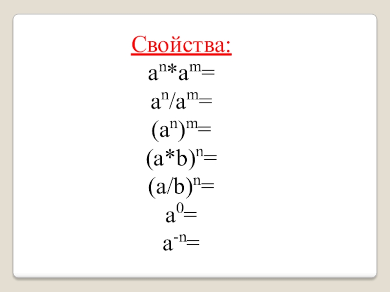 Свойства:an*am=an/am=(an)m=(a*b)n=(a/b)n=а0=a-n=
