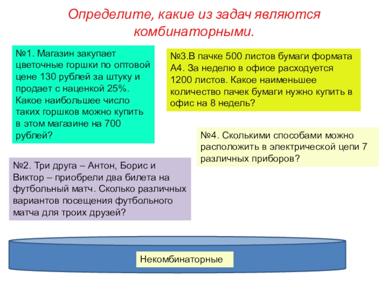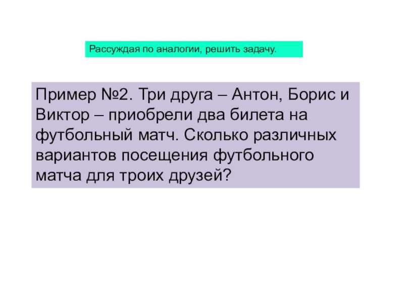 №2. Три друга – Антон, Борис и Виктор – приобрели два билета на футбольный матч. Сколько различных вариантов посещения футбольного матча для троих друзей?