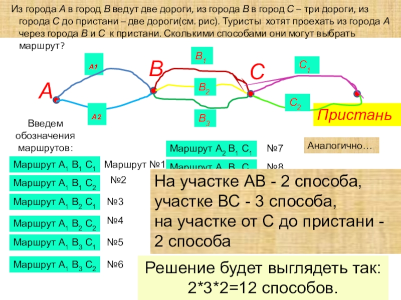 Из города А в город В ведут две дороги, из города В в город С – три дороги, из города С до пристани – две дороги(см. рис). Туристы хотят проехать из города А через города В и С к пристани. Сколькими способами они могут выбрать маршрут?