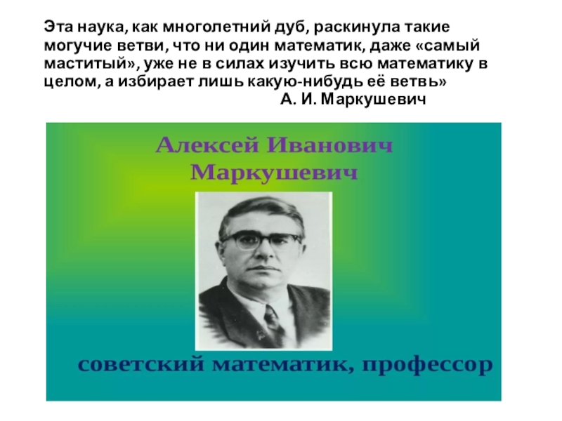 один математик, даже «самый маститый», уже не в силах изучить всю математику в целом, а избирает лишь какую-нибудь её ветвь» А. И. Маркушевич
