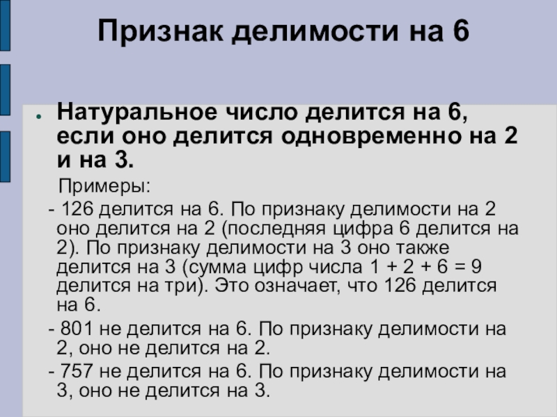 - 801 не делится на 6. По признаку делимости на 2, оно не делится на 2.