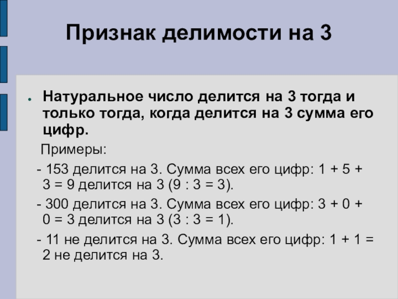 - 300 делится на 3. Сумма всех его цифр: 3 + 0 + 0 = 3 делится на 3 (3 : 3 = 1).