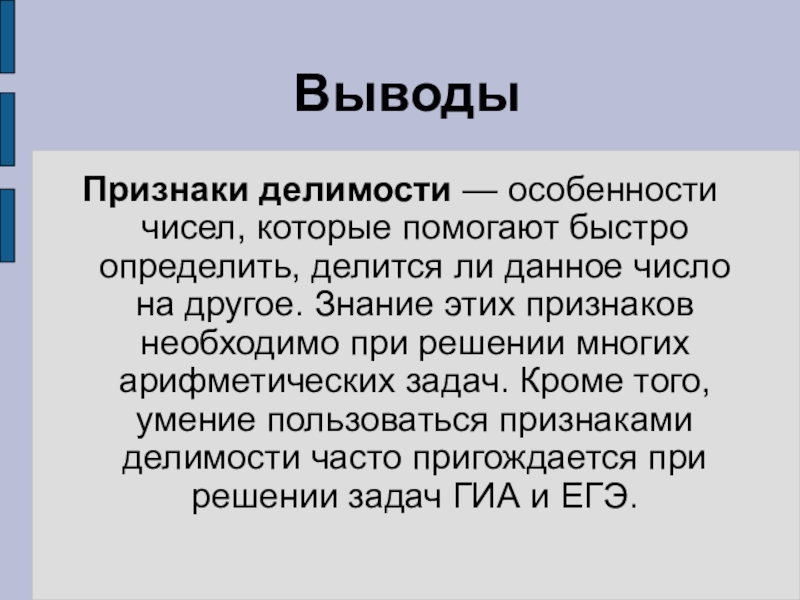 число на другое. Знание этих признаков необходимо при решении многих арифметических задач. Кроме того, умение пользоваться признаками делимости часто пригождается при решении задач ГИА и ЕГЭ.