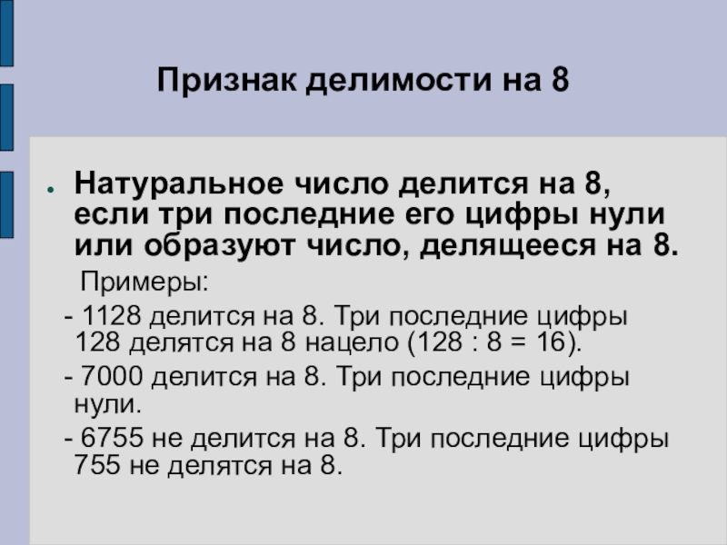 8 делится без остатка на 1, на 2, на 4 и на 8;