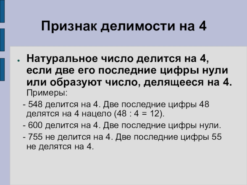 - 548 делится на 4. Две последние цифры 48 делятся на 4 нацело (48 : 4 = 12).