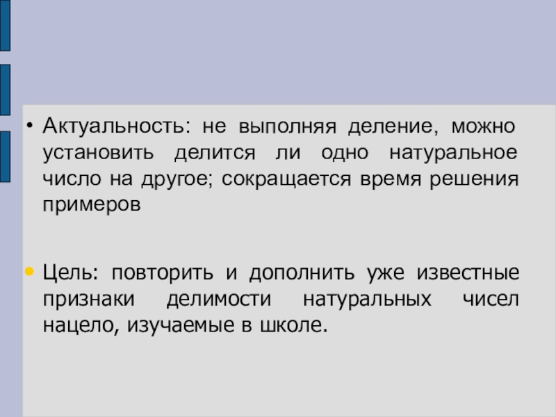 Актуальность: не выполняя деление, можно установить делится ли одно натуральное число