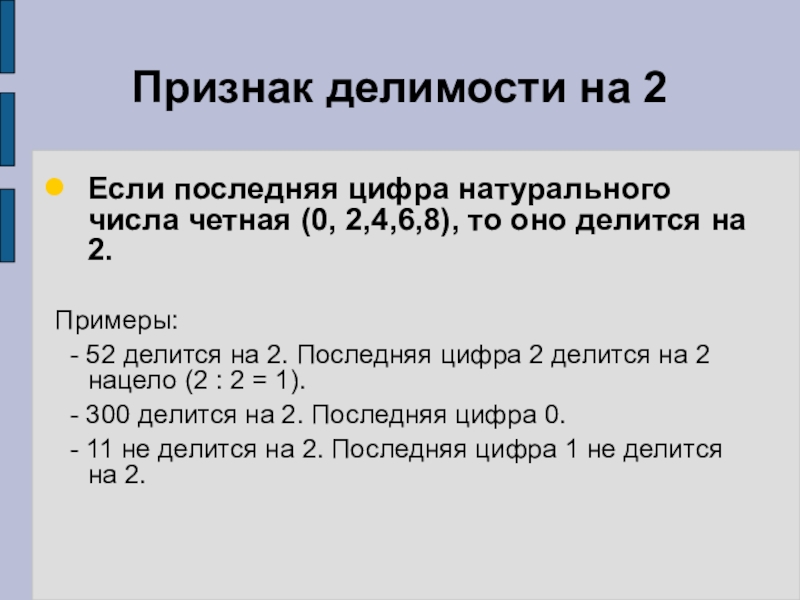 - 52 делится на 2. Последняя цифра 2 делится на 2 нацело (2 : 2 = 1).