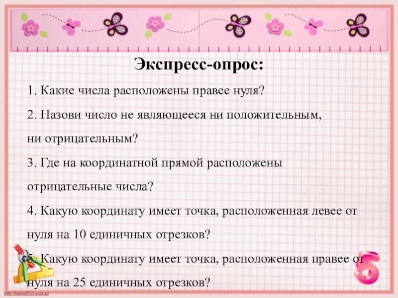 Экспресс-опрос:1. Какие числа расположены правее нуля?2. Назови число не являющееся ни положительным,ни отрицательным?3. Где на координатной прямой