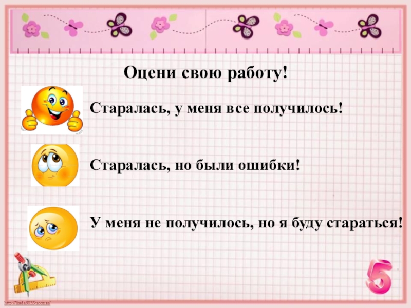Оцени свою работу!Старалась, у меня все получилось!Старалась, но были ошибки! У меня не получилось, но я буду