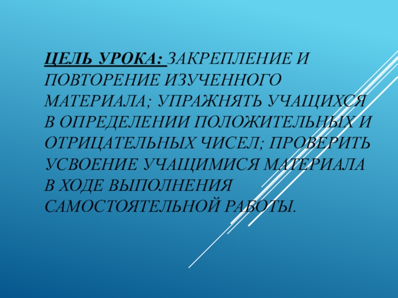 Цель урока: закрепление и повторение изученного материала; упражнять учащихся в определении положительных и отрицательных чисел; проверить усвоение учащимися материала в ходе выполнения самостоятельной работы.