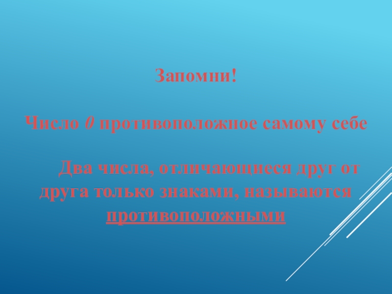 Запомни!Число 0 противоположное самому себе   Два числа, отличающиеся друг от друга только знаками, называются противоположными