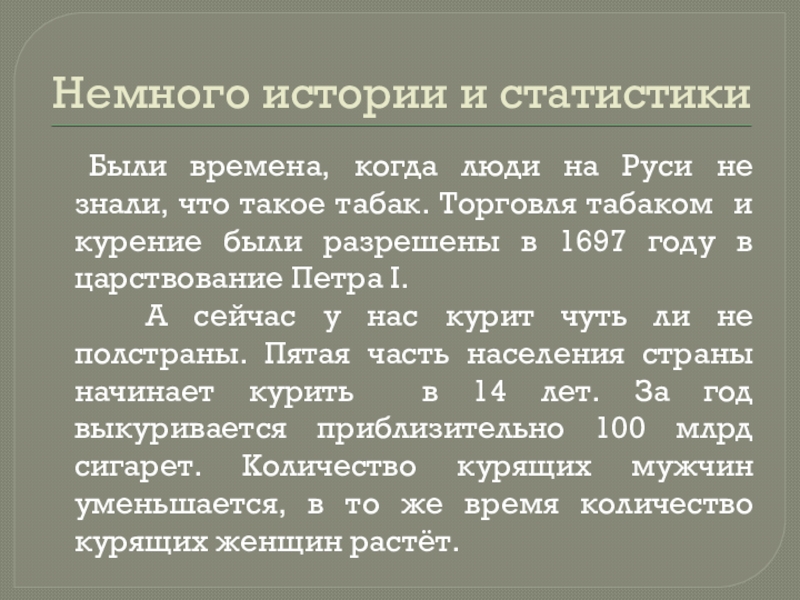 А сейчас у нас курит чуть ли не полстраны. Пятая часть населения страны начинает курить в 14 лет. За год выкуривается приблизительно 100 млрд сигарет. Количество курящих мужчин уменьшается, в то же время количество курящих женщин растёт.