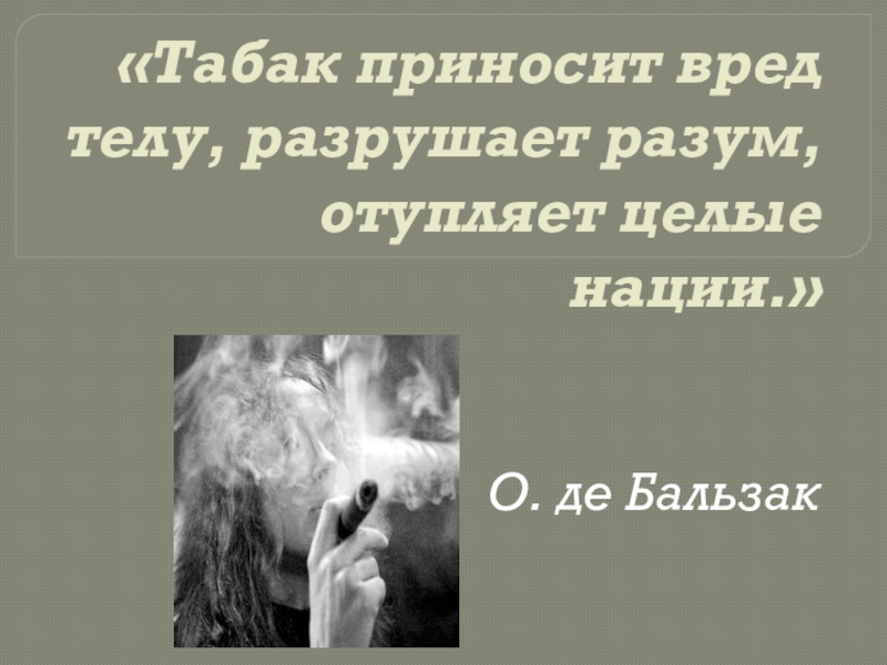 Слайд 5«Табак приносит вред телу, разрушает разум, отупляет целые нации.»