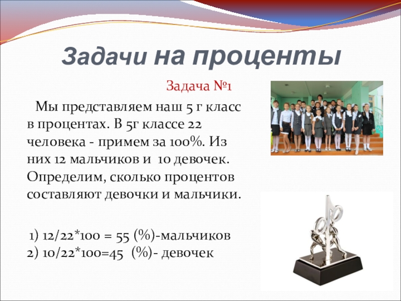 Мы представляем наш 5 г класс в процентах. В 5г классе 22 человека - примем за 100%. Из них 12 мальчиков и 10 девочек. Определим, сколько процентов составляют девочки и мальчики.