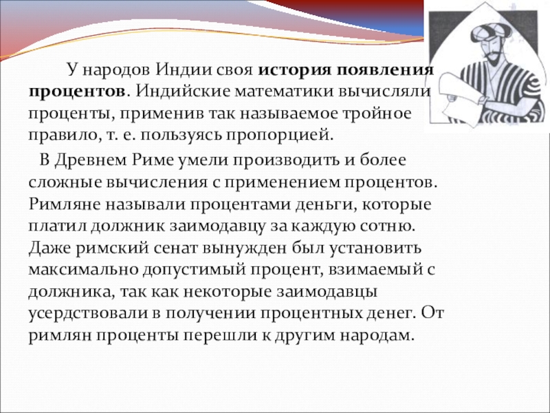Слайд 6 У народов Индии своя история появления процентов. Индийские математики вычисляли проценты,