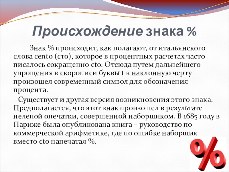 Знак % происходит, как полагают, от итальянского слова cento