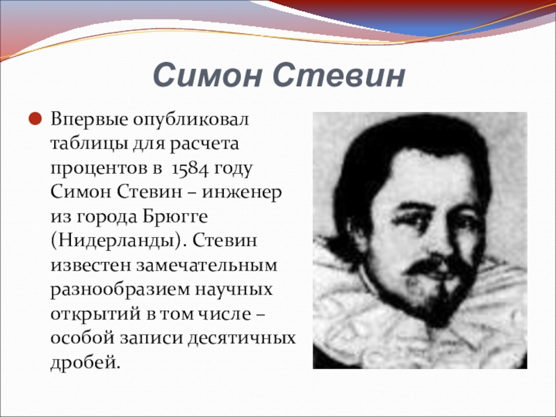 Впервые опубликовал таблицы для расчета процентов в 1584 году Симон