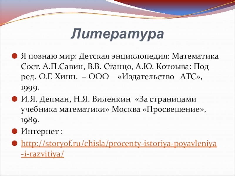 И.Я. Депман, Н.Я. Виленкин «За страницами учебника математики» Москва «Просвещение», 1989.
