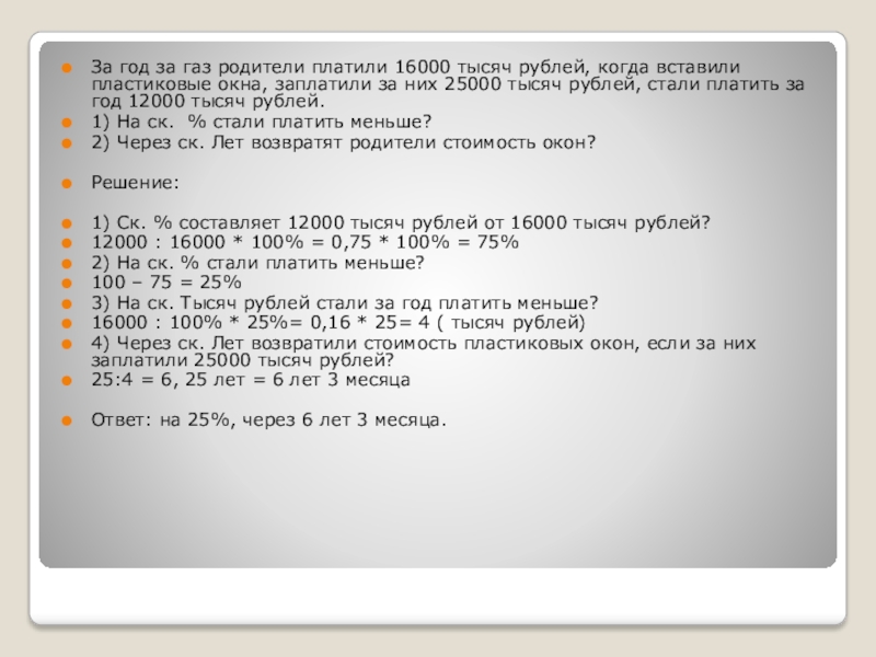 За год за газ родители платили 16000 тысяч рублей, когда вставили пластиковые окна, заплатили за них 25000 тысяч рублей, стали платить за год 12000 тысяч рублей. 1) На ск. % стали платить меньше? 2) Через ск.