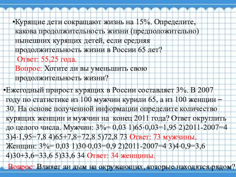 Ежегодный прирост курящих в России составляет 3%. В 2007 году по статистике из 100 мужчин курили 65, а из 100 женщин – 30. На основе полученной информации определите количество курящих женщин и мужчин на конец 2011 года? Ответ округлить до целого числа. Мужчин: 3%= 0,03 1)65·0,03=1,95 2)2011-2007=4 3)4·1,95=7,8 4)65+7,8=72,8 5)72,8 73 Ответ: 73 мужчины. Женщин: 3%= 0,03 1)30·0,03=0,9 2)2011-2007=4 3)4·0,9=3,6 4)30+3,6=33,6 5)33,6 34 Ответ: 34 женщины.