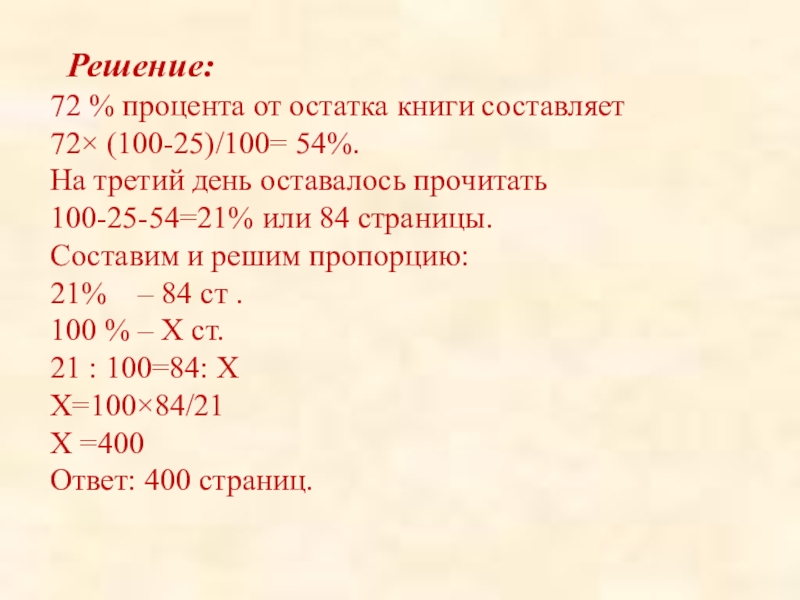 За первый день мальчик прочитал 25% всей книги, за второй - 72% от количества страниц что осталась, а за третий - остальные 84 страницы. Сколько страниц в книге?